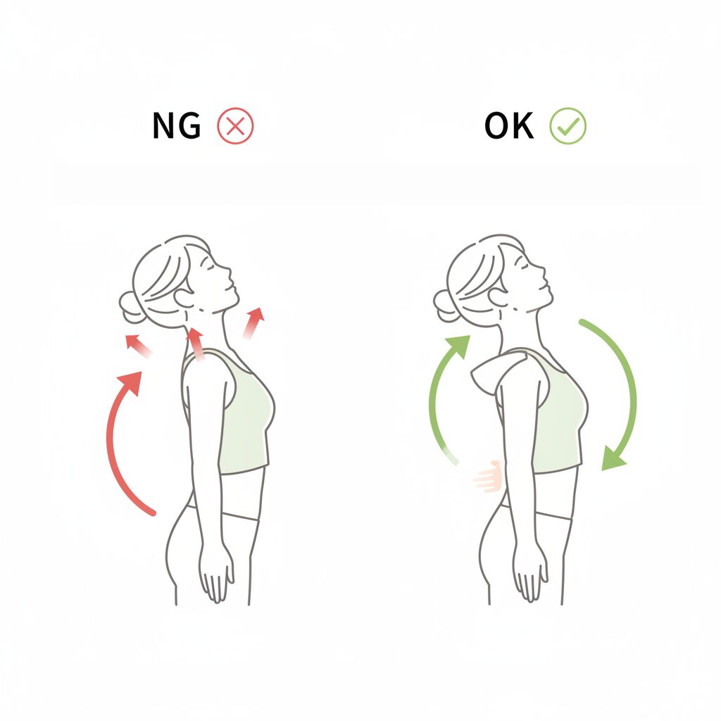 NG:胸を前に突き出す/下制だけで首が縮む。