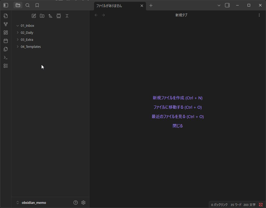 Obsidianを開いたら、まず画面左上の「新規フォルダ」アイコンをクリックして 、以下の4つのフォルダを作成しましょう。