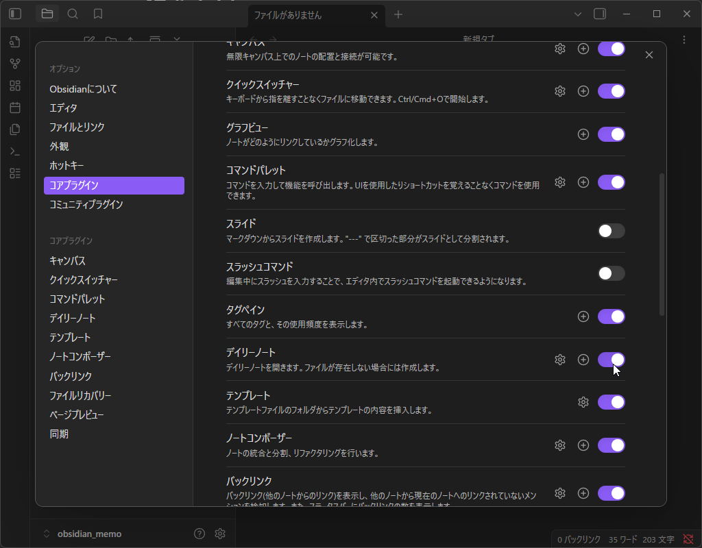 次に、Obsidianの標準機能である「デイリーノート」を有効にしましょう。