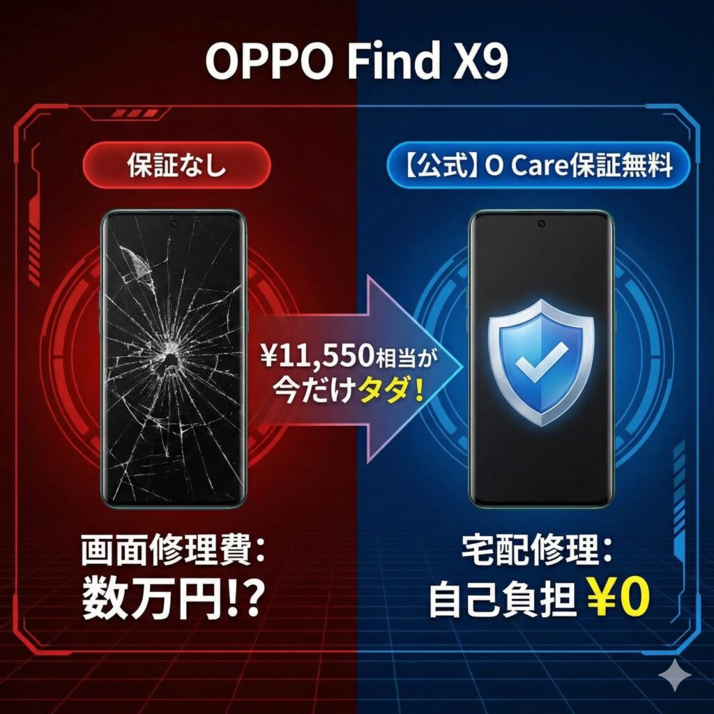 最新のOPPO Find X9は、これまでのハイエンド機の常識を覆すスタミナの怪物です。しかも、今なら公式ショップ限定で「壊した時のリスク」をゼロに近づける最強の保証が無料でついてきます。