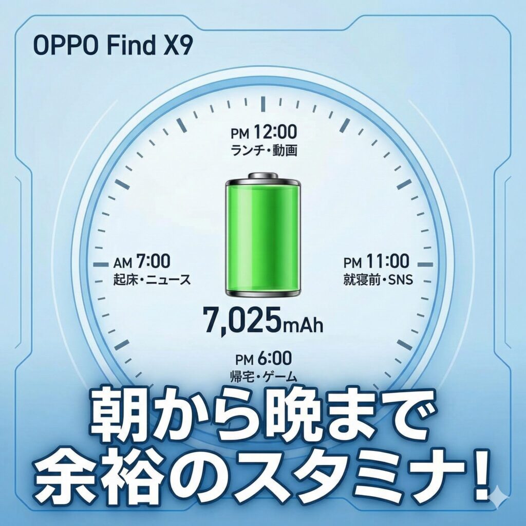 結論から言います。今回のFind X9、一番の進化はカメラでも画面の綺麗さでもなく、「7,025mAh」という異次元のバッテリー容量です。